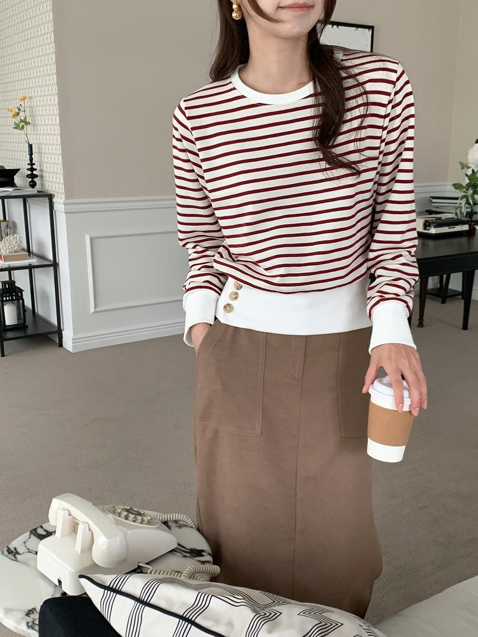 A chic and casual striped T-shirt featuring stylish button details on the cuffs for a modern twist. With its versatile design, this top pairs beautifully with skirts, trousers, or denim, making it an essential piece for both casual outings and office wear. The relaxed fit ensures comfort while maintaining a polished look.